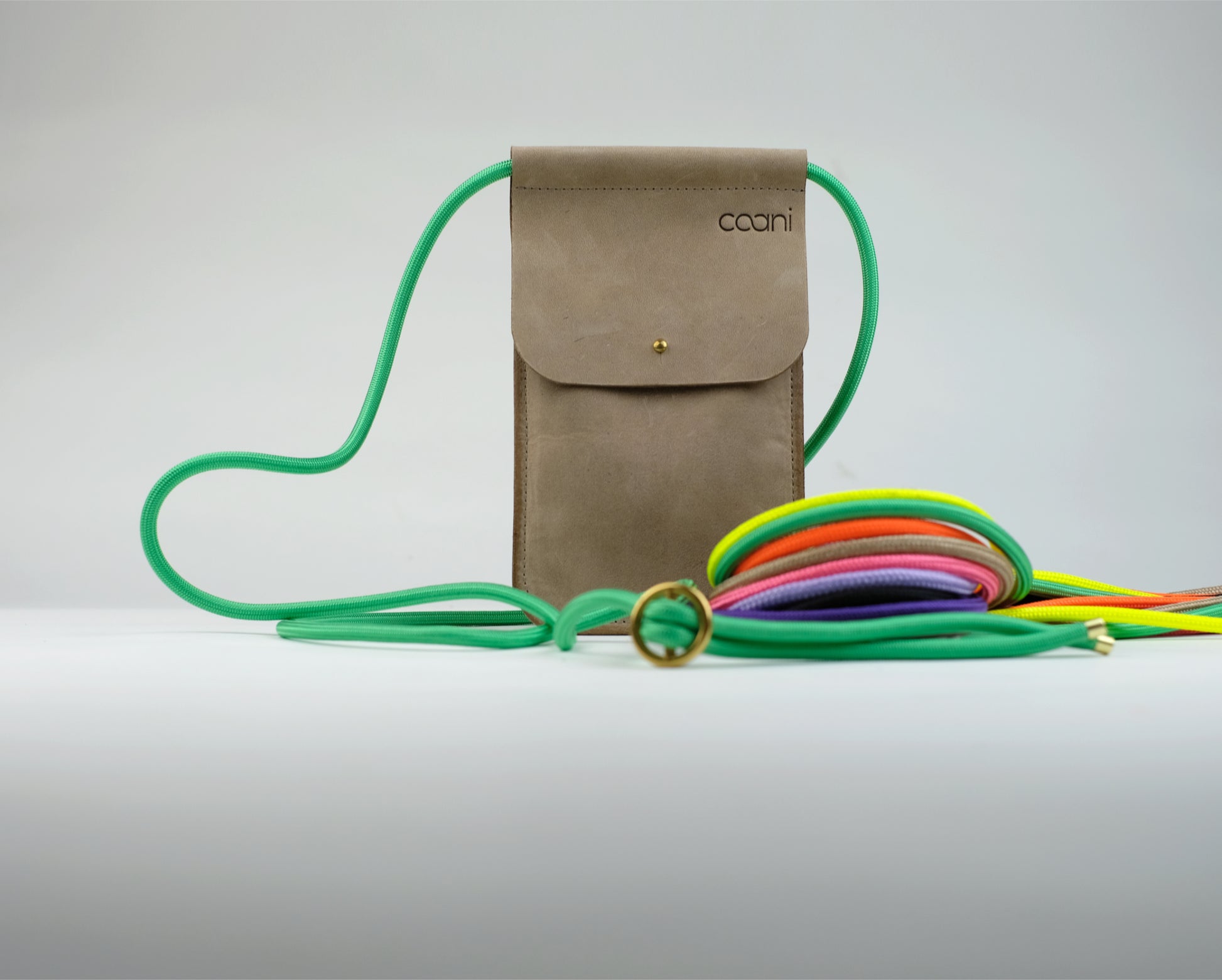 Loki besitzt kein Innenfutter und wird mit einem Metallknopf geschlossen. Mit Hilfe einer Metallschnalle kannst du sie ganz einfach stufenlos einstellen. Auf der Vorderseite ist unser Logo geprägt. Innen befinden sich zwei Steckfächer für dein Handy, Geld oder auch einen flachen Schlüssel.