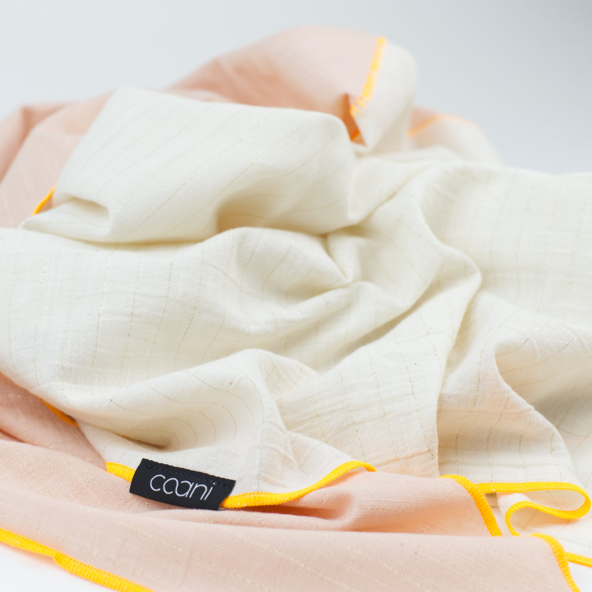 Das luftige Dreieckstuch bringt Farbe in dein Leben. Der gold glänzende Streifen verleiht dem Tuch eine edle und besondere Optik und die Kante in Neonorange setzt einen tollen Kontrast.